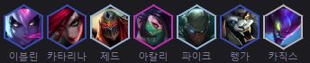 챔피언 : 이블린, 카타리나, 제드, 아칼리, 파이크, 렝가, 카직스