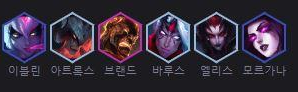 챔피언 : 이블린, 아트록스, 브랜드, 바루스, 엘리스, 모르가나