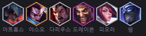 챔피언 : 아트록스, 야스오, 다리우스, 드레이븐, 피오라, 쉔