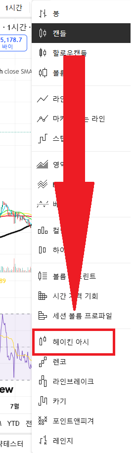 누르면 나오는 리스트중 밑에 있는 헤이킨 아시 클릭